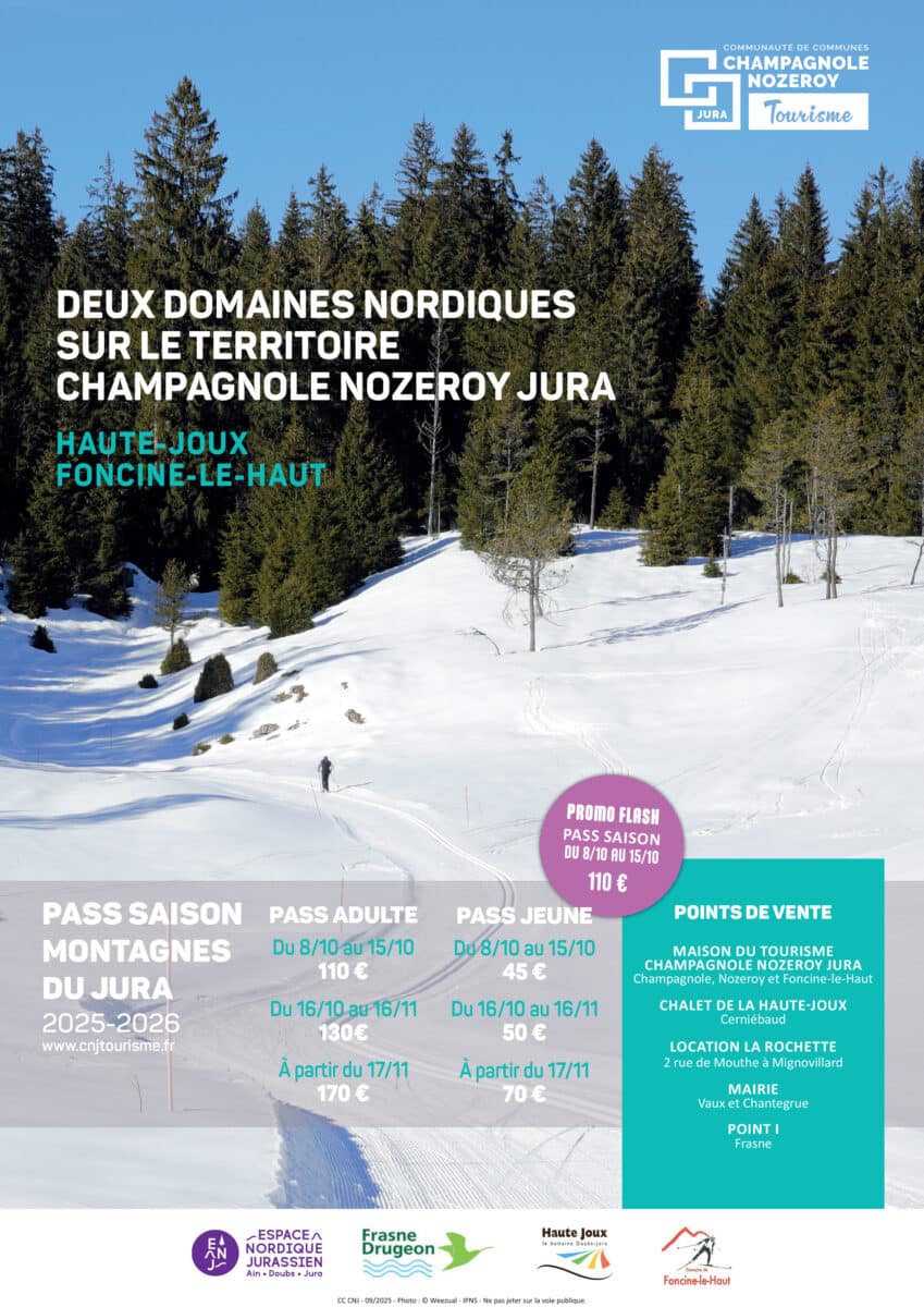 En vente sur https://pass.espacenordiquejurassien.com/ et dans les 3 bureaux de la Maison du tourisme à Champagnole, Nozeroy et Foncine-le-Haut.