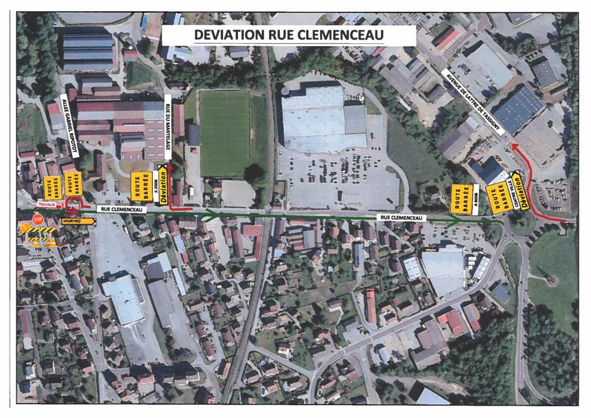 L’emprise des travaux se situe rue Clémenceau (uniquement sur la voie de circulation côté bureau de tabac), l’accès au Centre-Ville sera donc interdit.