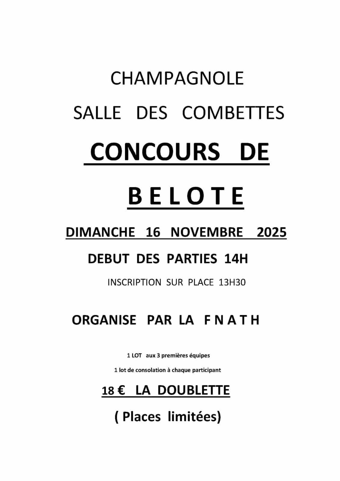 concours de belote Dimanche 16 novembre 2025 Champagnole Salle des Combettes 18€ la doublette Infos pratiques Email non disponible Téléphone non disponible Site internet non disponible