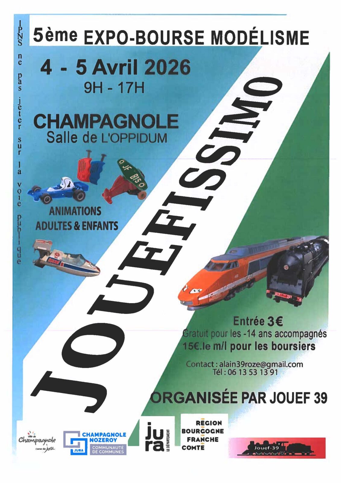 Jouefissimo 4 et 5 avril 2026 Champagnole L'Oppidum 3€ Infos pratiques Contacter par email : alain39roze@gmail.com Appeler au 06 13 53 13 91 Site internet non disponible