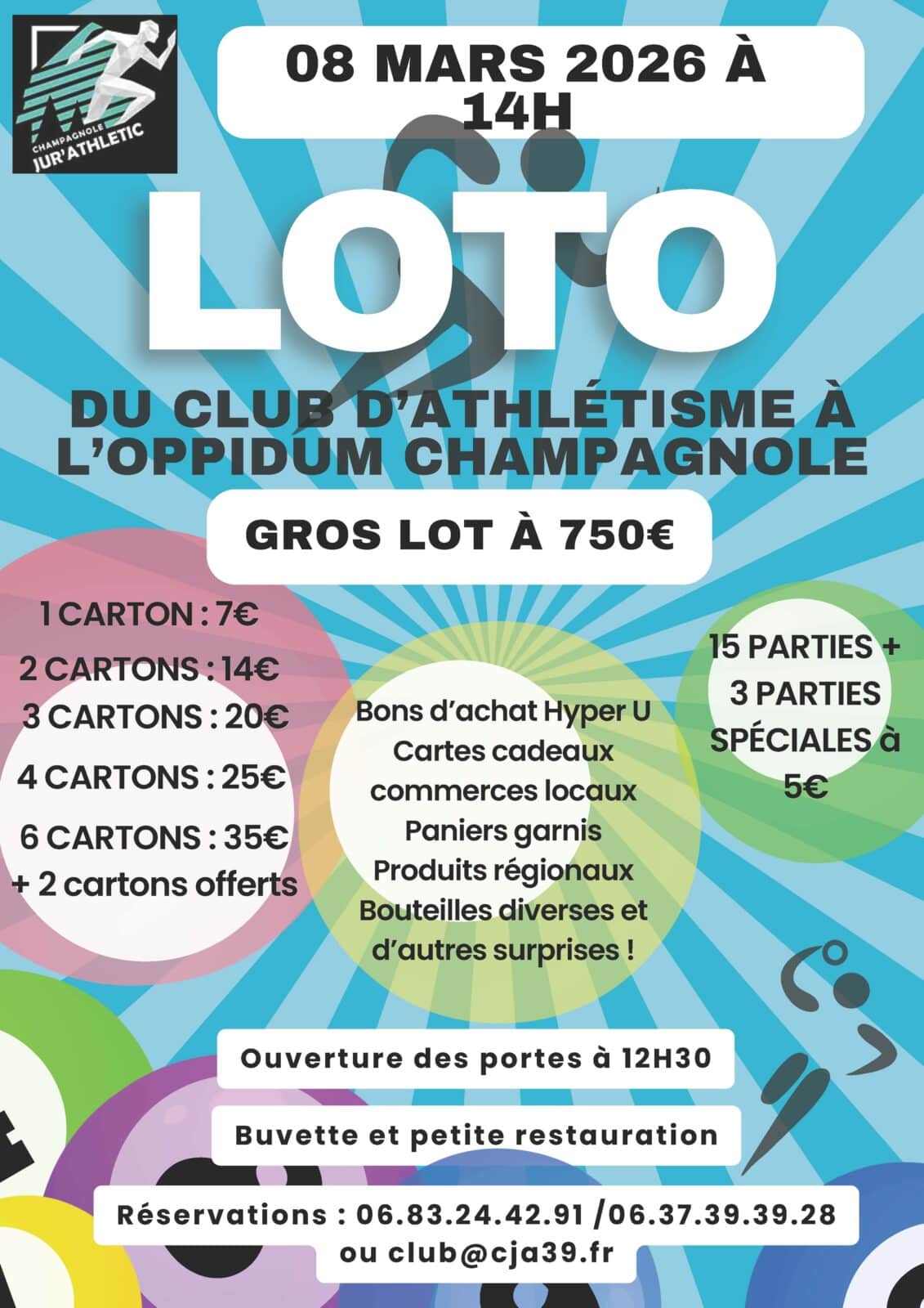 Loto du club d’ Athlétisme Dimanche 08 mars 2026 Loisirs Champagnole L'Oppidum Infos pratiques Contacter par email : club@cja39.fr Appeler au 06 83 24 42 91 Site internet non disponible