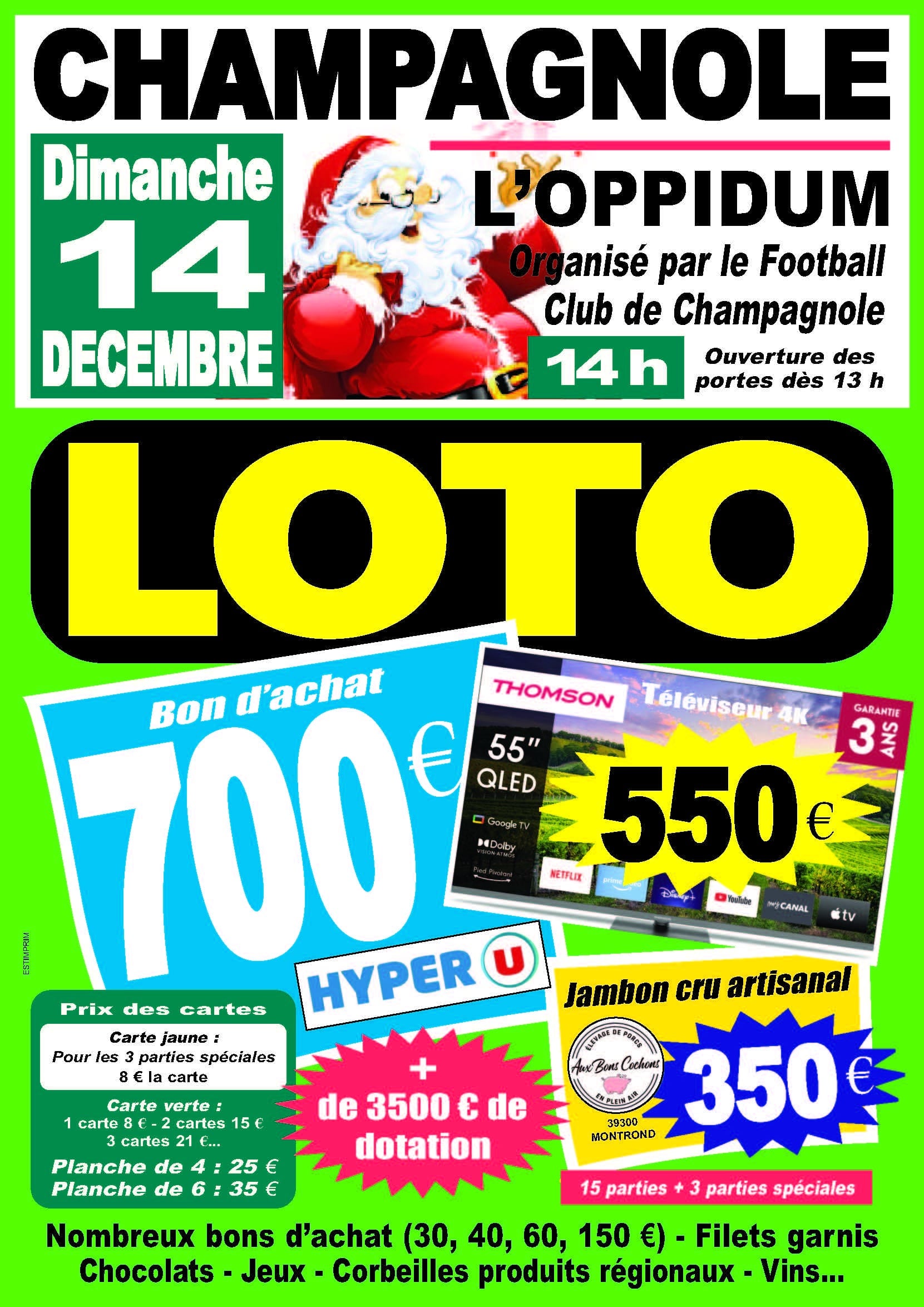 Loto Football Club Champagnole Dimanche 14 décembre 2025 Loisirs champagnole L'Oppidum tarif en fonction de la carte choisie Infos pratiques Email non disponible Téléphone non disponible Site internet non disponible