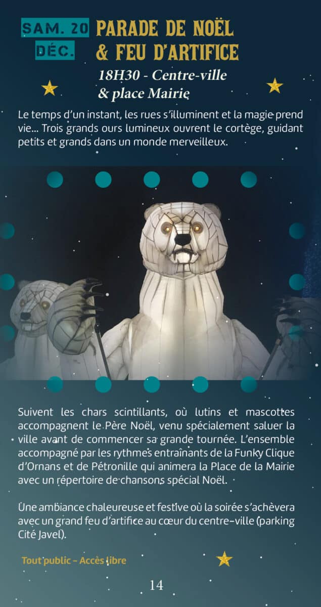 Parade de noël & feu d’artifice Samedi 20 décembre 2025 Loisirs Centre-ville / Place de la Mairie / Parking Cité Javel (feu d'artifice) 18H30 Infos pratiques Email non disponible Téléphone non disponible Site internet non disponible