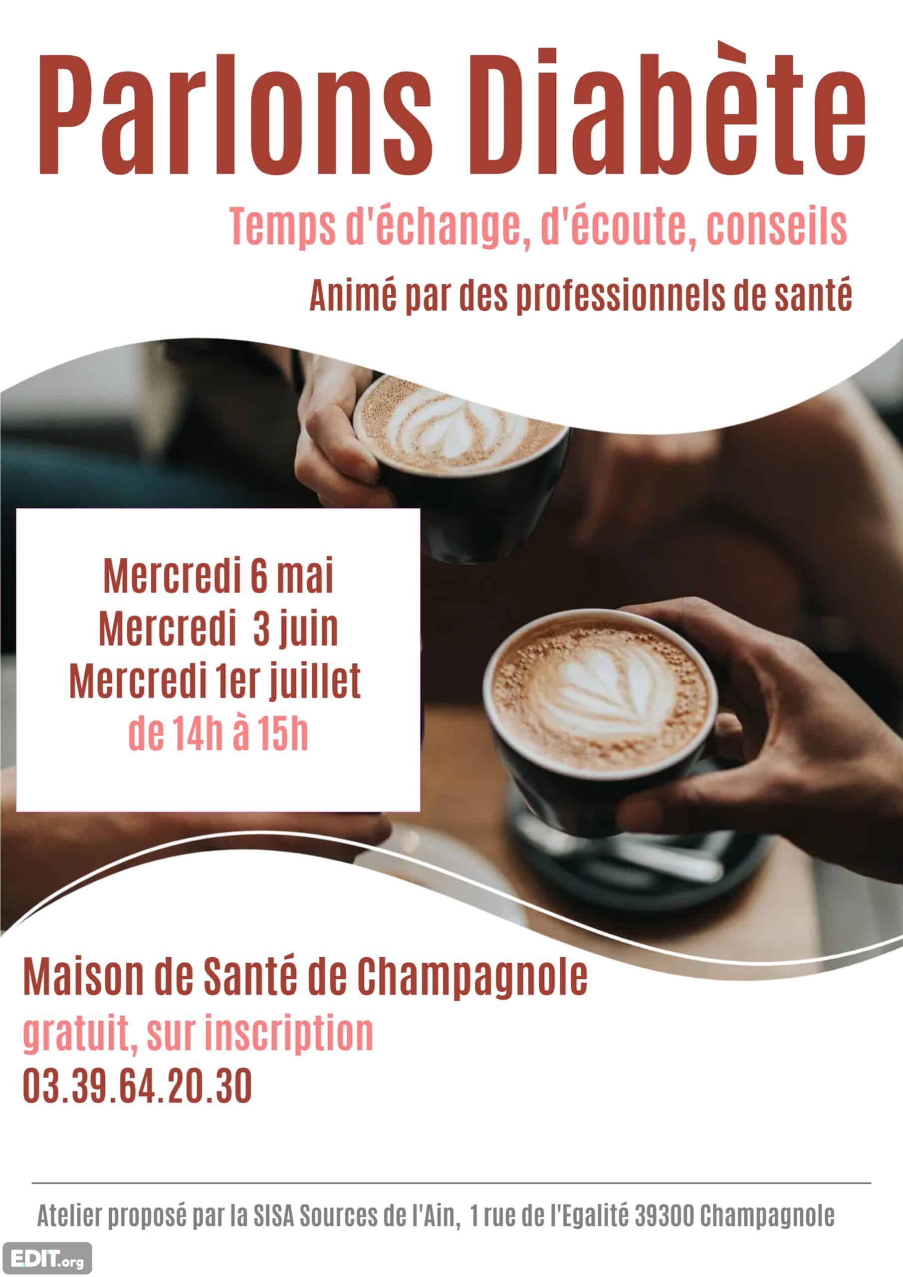 Parlons Diabète Mercredi 6 mai 2026 Champagnole Maison de Santé CHampagnole gratuit sur inscription Infos pratiques Email non disponible Appeler au 03 39 64 20 30 Site internet non disponible
