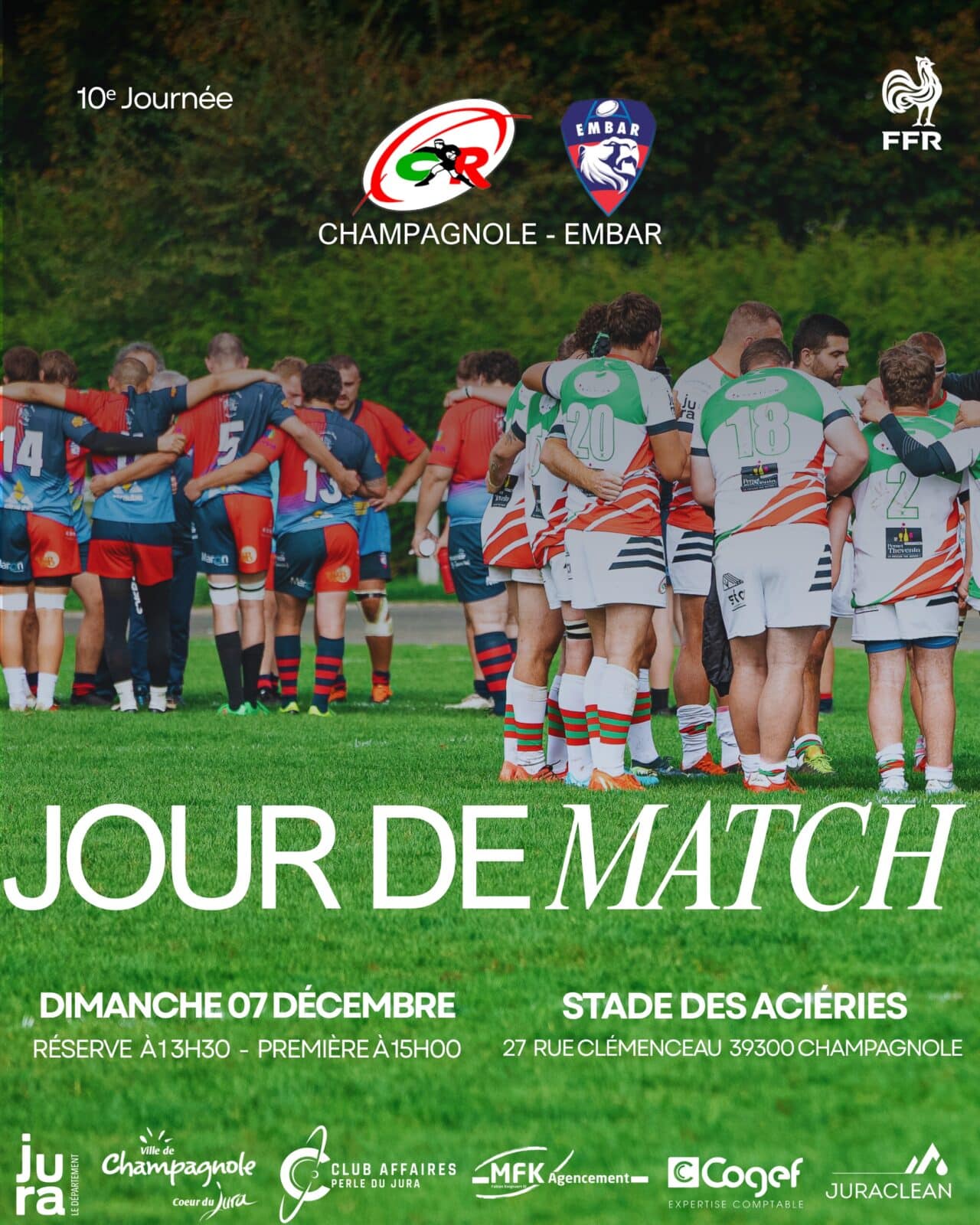 Rugby : Champagnole V/S Embar Dimanche 07 décembre 2025 Sport Champagnole Stade des Aciéries Infos pratiques Email non disponible Téléphone non disponible Site internet non disponible